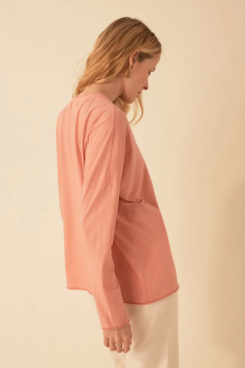 Avec ses finitions roulottées et son col V légèrement décolleté pour vous mettre en valeur, le t-shirt manches longues est confectionné dans un élégant coton doux et durable. • T-shirt col V femme • Coupe droite • Manches longues • Emmanchures tombantes • Finitions roulottées • T-shirt basique femme réalisé en coton pima connu pour être un coton fin luxueux doux et durable • Coloris Praline : un vieux rose vaporeux • Modèle dessiné à Paris par notre styliste • Fabriqué au Portugal • Longueur : 62 cm pour une taille 1 • Alex mesure 1,74m et porte une taille 1 • Conseil style : portez-le rentré dans le jean Loumi avec des baskets ou des bottines selon votre envie du jour