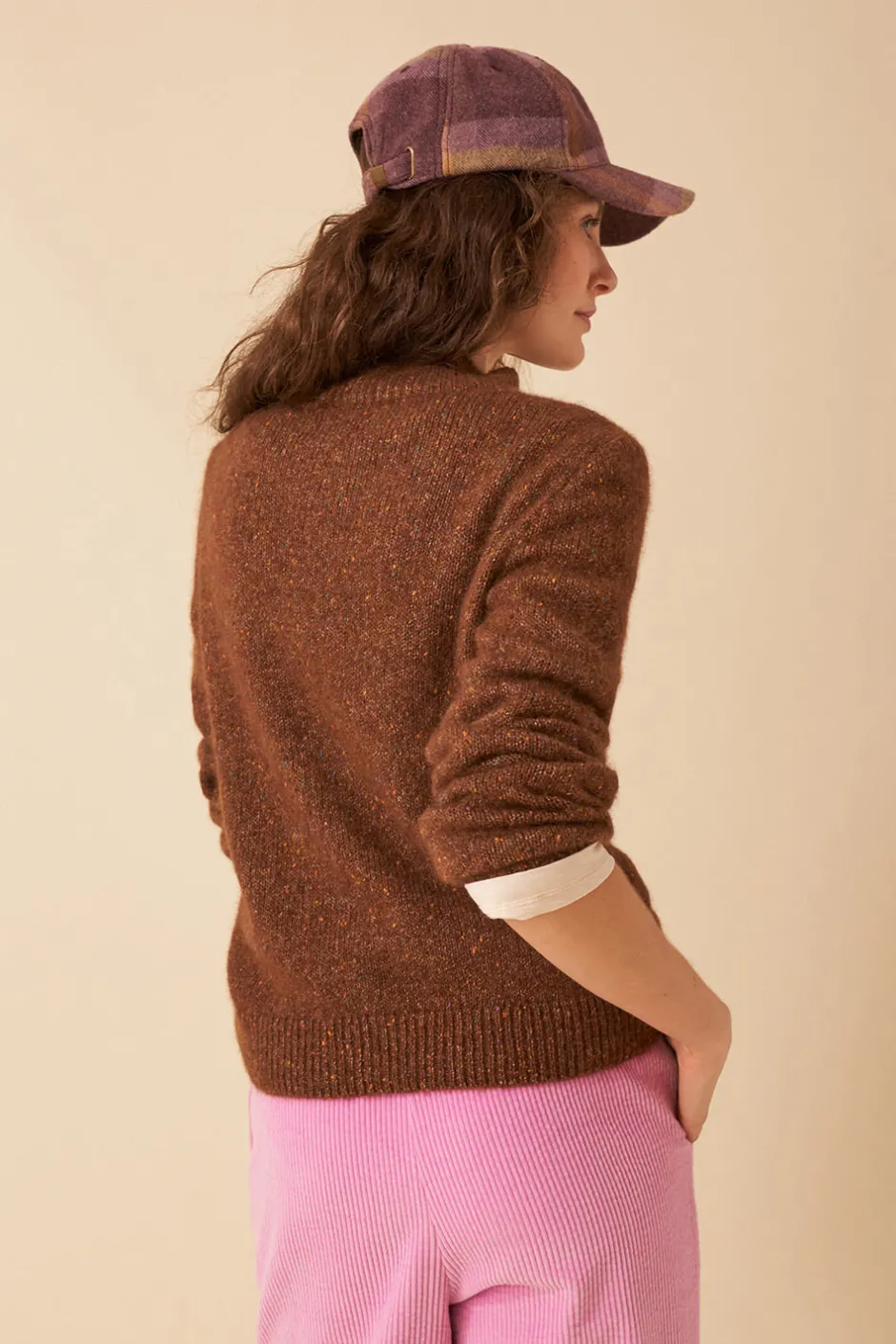 Col montant, patte de boutonnage à l’épaule et coloris vintage, ce pull chaud et couvrant à l’esprit pull de ski revisité dans une maille élégante ne vous quittera pas de la saison. • Pull droit • Col montant • Patte de boutonnage à l’épaule • Finitions en bord-côte • Pull chaud réalisé en nouveau fil italien du groupe « Boutonné » composé d’un mélange de coton biologique, laine Mérinos certifiée RWS, Baby Alpaga et nylon recyclé. Le fil de coton ressort légèrement, ce qui lui donne un aspect boutonné. Aspect duveteux et très doux au porté. • Coloris Bretzel : un marron mocha • Modèle dessiné à Paris par notre styliste • Longueur : 57 cm • Léa mesure 1,77m et porte une taille 1 • Conseil style : portez-le avec le jean Louisette et des baskets pour vos journées marathon • Conseil taille : cet article taille normalement, choisissez votre taille habituelle
