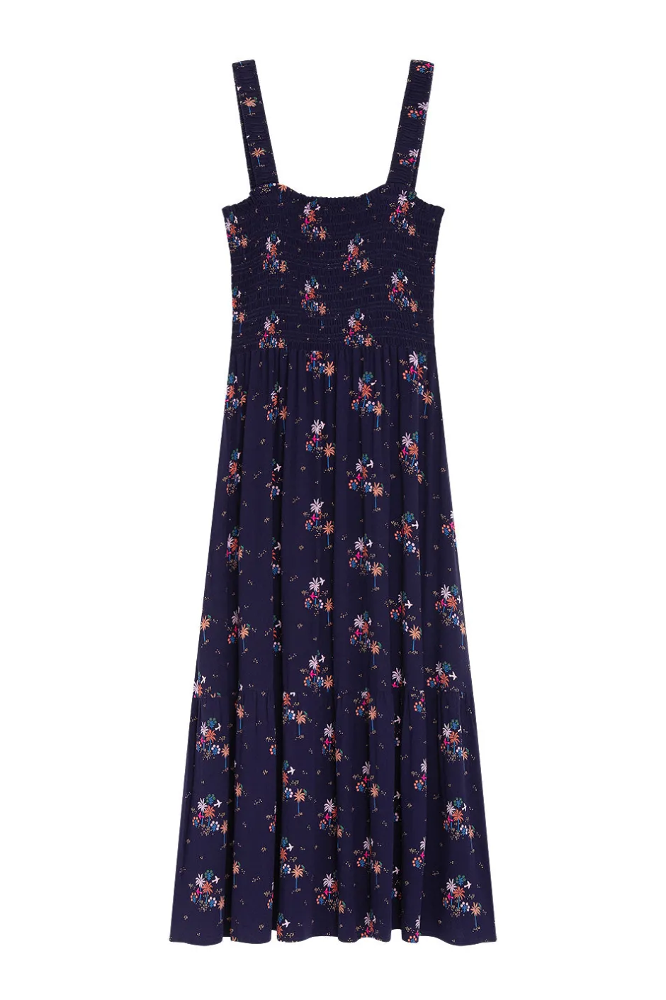 L’été rimera avec confort et légèreté dans cette robe longue en crêpe de viscose. Animée d’un motif bohème et poétique, vous serez séduite par son bustier smocké et sa base longue fluide au rendu vaporeux. • Robe longue fluide • Haut bustier entièrement smocké • Large bretelles smockées • Base froncée et volantée • Robe longue bohème réalisée en crêpe de viscose fluide et légère • Imprimé exclusif Des Petits Hauts Ouma illustrant un paysage exotique mêlant palmiers, oiseaux et fleurs colorées inspirés d’un carnet de voyage sur un fond bleu indigo • Modèle dessiné à Paris par notre styliste • Longueur : 129 cm pour une taille 1 • Madalena mesure 1m77 et porte une taille 1 • Conseil style : portez-la avec les sandales Nayla et le sac Lisbone pour une escapade en bord de mer