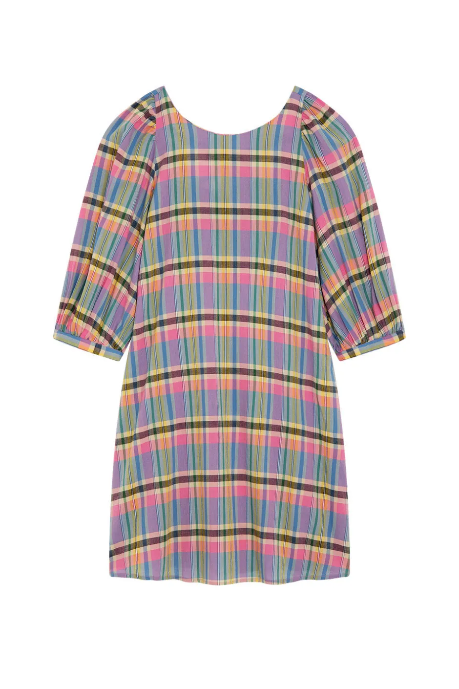 Cette robe à la décontraction sophistiquée séduit par son motif madras réinterprété. Jouant les volumes assumés …