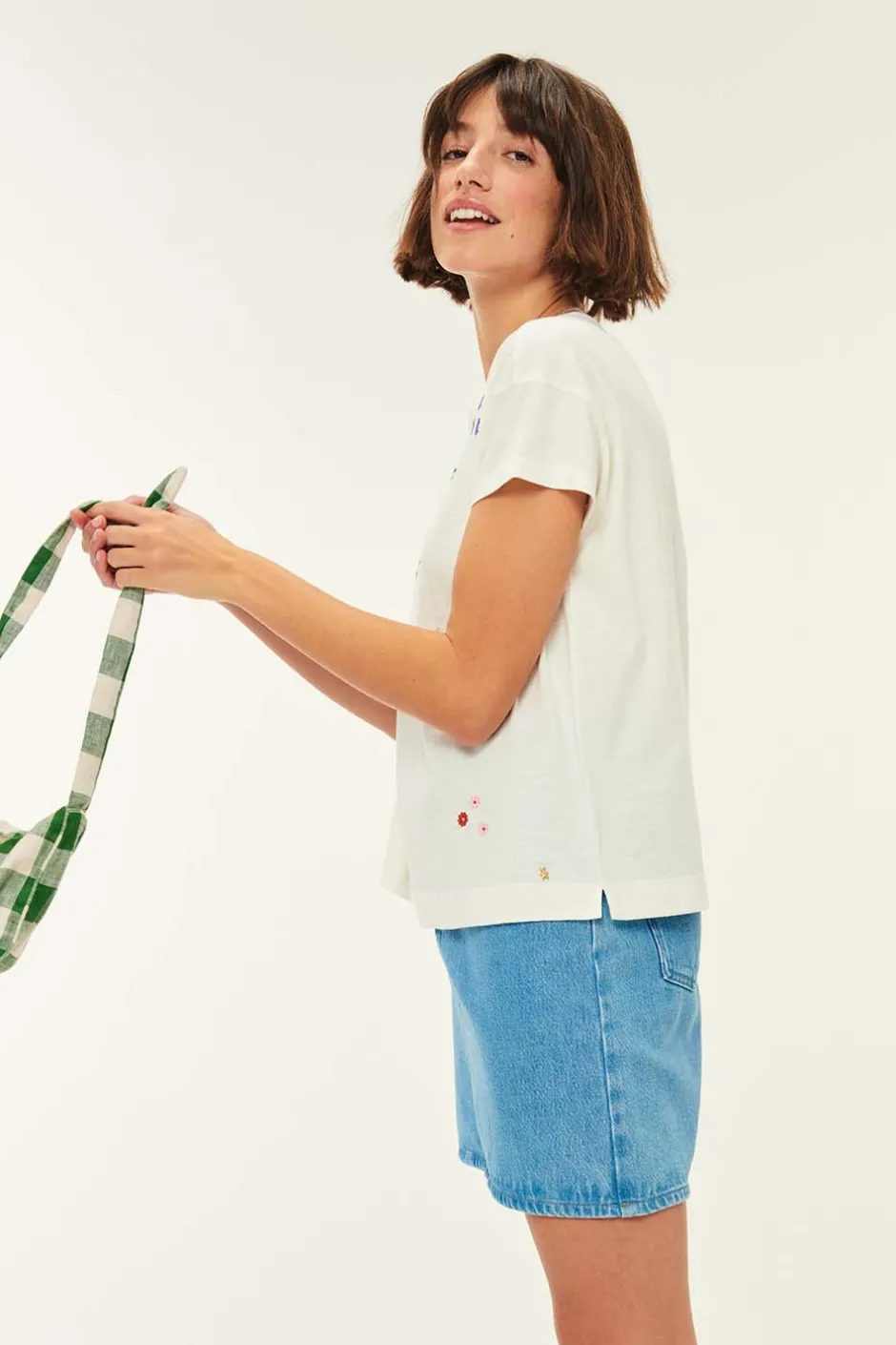 Chaque saison, Des Petits Hauts offre une interprétation inédite de son emblématique t-shirt en coton flammé. Invitant au voyage, cet été il nous plonge dans un univers poétique avec ses illustations figuratives brodées. • T-shirt manches courtes • Coupe droite • Encolure ronde • Oiseaux, palmiers et message brodés • Coloris Écru : un blanc écru naturel • Modèle dessiné à Paris par notre styliste • Fabriqué au Portugal • Longueur : 60 cm • Kathie mesure 1m77 et porte une taille 1 • Conseil style : portez-le rentré dans un pantalon large avec des sandales pour un look de printemps