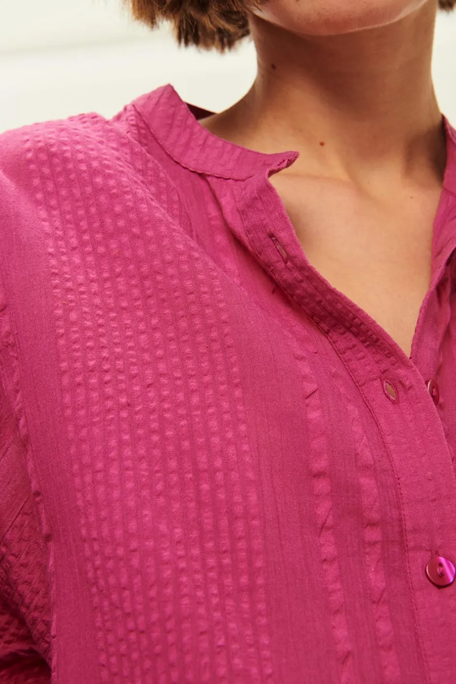 Incontournable du vestiaire printanier, la blouse se porte manches bouffantes et animée de rayures à l’effet gauffré pour l’occasion. Déclinée dans un coloris neutre ou plus dynamisant, vous ne résisterez pas à ce modèle facile à coordonner. • Blouse femme en coton • Manches longues bouffantes • Emmanchure carrée • Tête et bas de manches froncés • Poignet chemise boutonné à fente invisible • Col rond • Ouverture boutonnée • Blouse réalisée en coton à rayures légèrement gaufrées • Coloris Sunset : un rose fuchsia intense • Longueur : 63 cm pour une taille 1 • Kathie mesure 1m77 et porte une taille 1 • Conseil style : portez-la avec le jean mum Simeon et des mocassins pour un look bohème et citadin